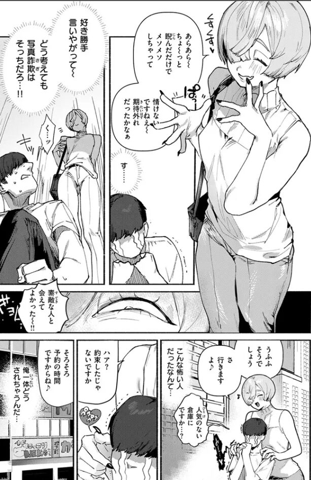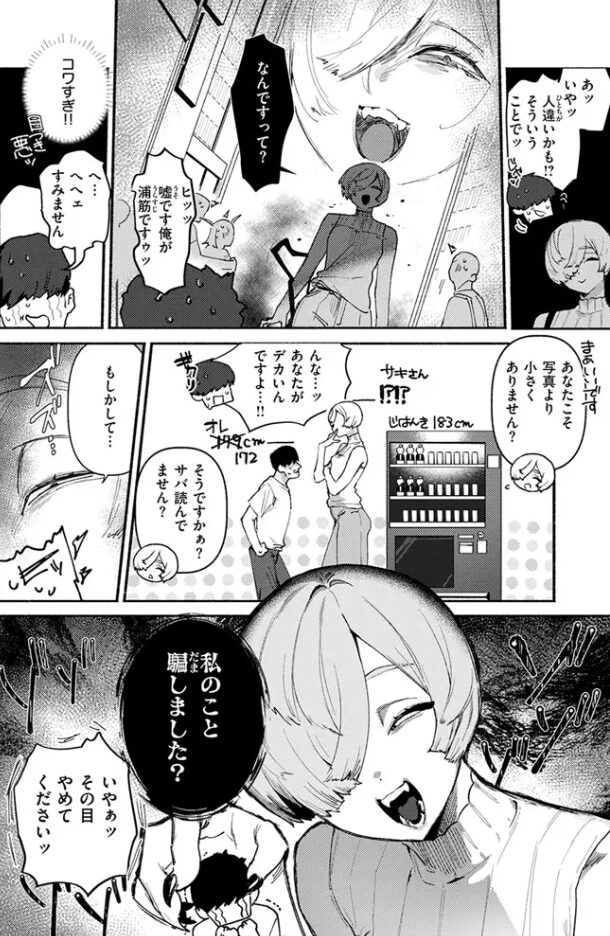マッチングアプリの女性が予想以上に背が高くて怖い!と思いつつも心を許した途端にホテルでがっつり襲われちゃうエロ漫画です♪